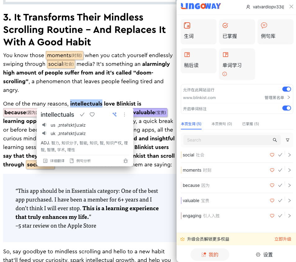 LingoWay根据你设置的词汇难度,自动高亮并进行翻译。在浏览网页时只需专注自己生疏的词汇,无时不刻被动刺激加强记忆